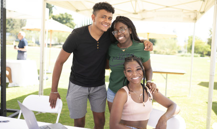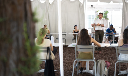 Five CMC students work and study together outdoors on a table beneath a tree, feeling free to express themselves.