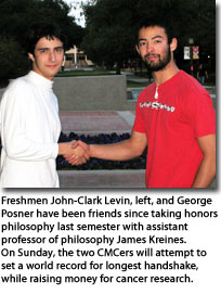 "We're allowed to snack, as long as we keep the handshake going," Levin explains. "Water and food will be provided to us in McKenna Auditorium. Last week we practiced eating while shaking hands. We started shaking hands in CMC's South Quad and walked down for a Greek dinner in the Claremont Village, shook hands all through dinner, and didn't stop until we were back in Stark Hall. We sure got our share of strange looks from passers-by! As far as bathroom breaks, we simply won't take any."